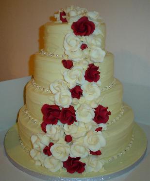 White chocolate covered stacked wedding cake, ellegantly decorated with hand crafted sugar paste roses in deep red and cream