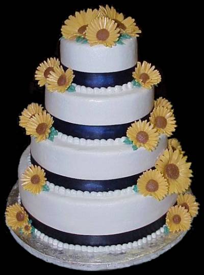 Buttercream icing with fondant sunflowers and navy satin ribbon.
